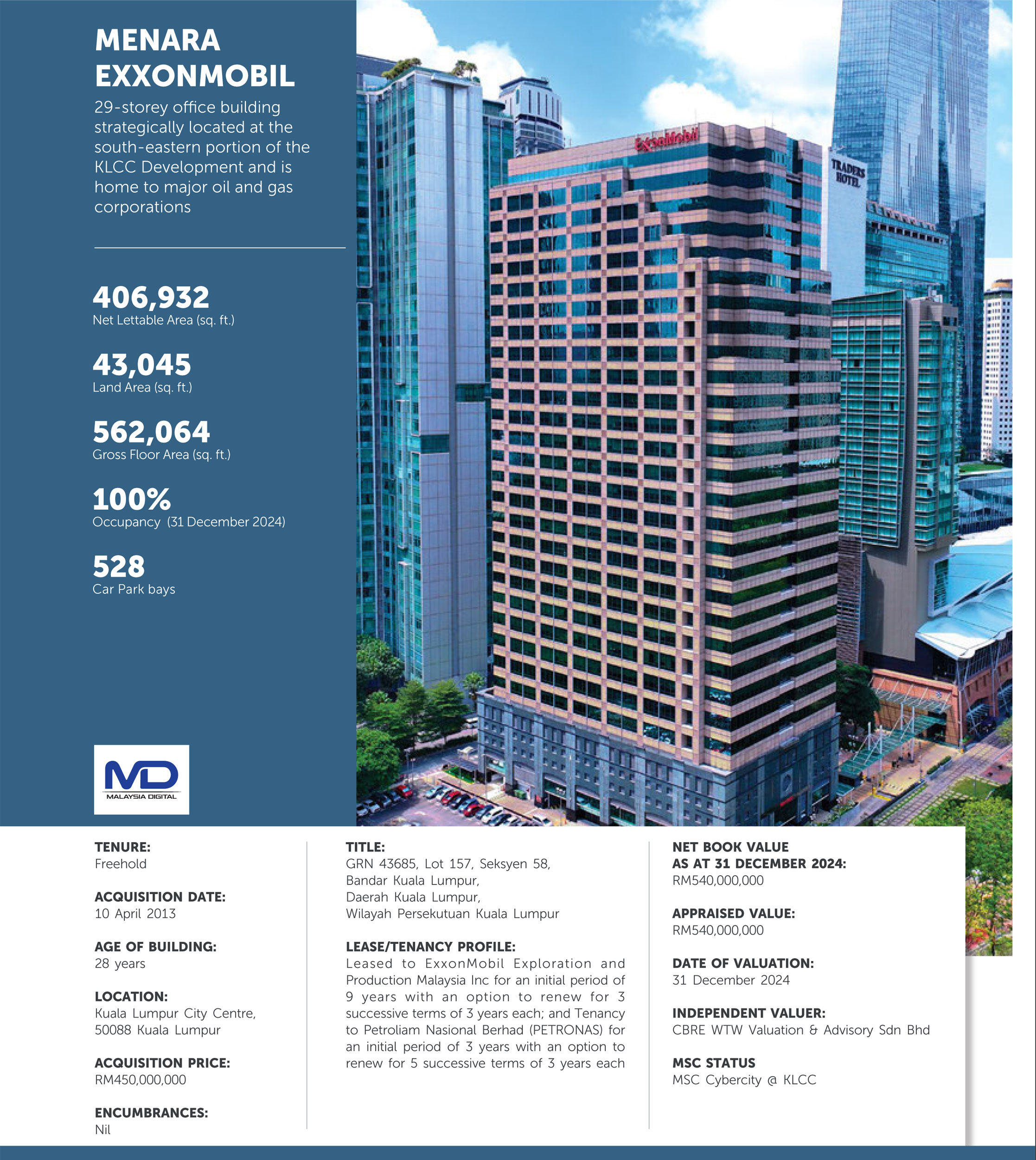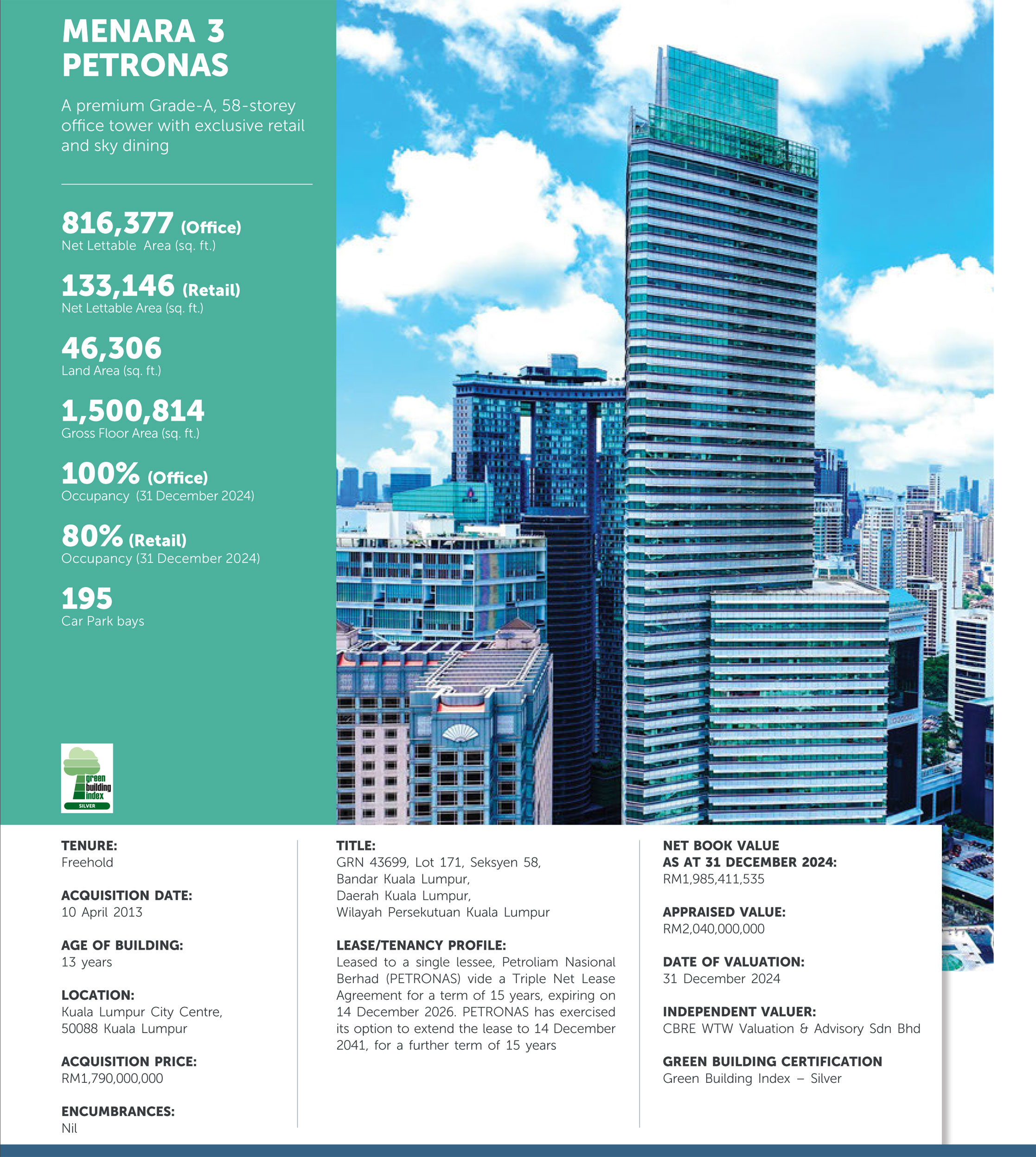 The properties have a combined Net Lettable Area (NLA) of over 4.55 million sq. ft. within the 100-acres KLCC Development which ranks among the largest real-estate developments in the world. KLCC is designed as a place where people can work, live, shop, meet, relax, eat and enjoy the leisure and cultural activities in a convenient and pleasant environment.