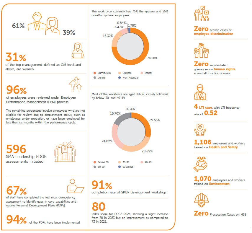We continue to facilitate the PETRONAS Organisation Climate Survey (POCS), a comprehensive annual initiative designed to evaluate and enhance PETRONAS’ organisational culture. POCS demonstrates the Group’s commitment to creating a more inclusive, engaging and supportive work environment for all employees, in line with Goal 3 under the People pillar within our Sustainability Plan 2030.