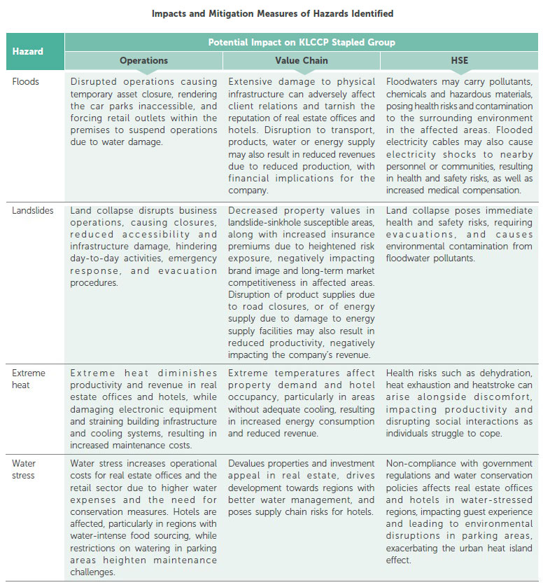 In September 2024, the Securities Commission announced the National Sustainability Reporting Framework (NSRF), requiring Main Market listed companies with market capitalisations of more than RM2 billion to disclose in accordance with IFRS S1 and S2 starting in 2025, with full adoption of the standards by 2027. Bursa Malaysia had also revised it’s Main Market Listing Requirements in December 2024, with the requirement to align with TCFD recommendations disapplied and substituted with IFRS S1 and S2. KLCCP Stapled Group, while maintaining the alignment with TCFD recommendations in our climaterelated disclosure for the year under review, will pursue IFRS S1 and S2 disclosures in phases, considering the reliefs allowed within the NSRF, and leveraging the data as well as systems put in place from earlier preparations made for TCFD.