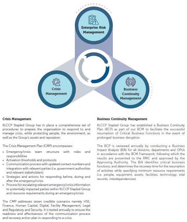 Risk management forms an integral part of KLCCP Stapled Group’s business and supports the delivery of our strategy while underpinning the Group’s business model. Our risk management policy and procedures are designed to embrace best practices, reduce the potential of financial and nonfinancial risk exposure (including exposure to climate change risk), and protect our assets and reputation.