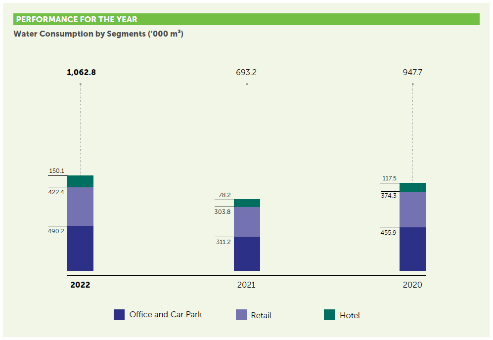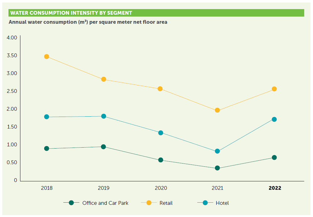 Water consumed across our office buildings, retail malls and hotel facilities is sourced or withdrawn entirely from municipal water supplies with no use of surface or groundwater. All discharged water from our facilities flows into municipal sewerage systems and is subsequently treated by public sewage treatment plants (STPs) in compliance with local regulations. As such, there are no specific effluent quality requirements applicable to our organisation.