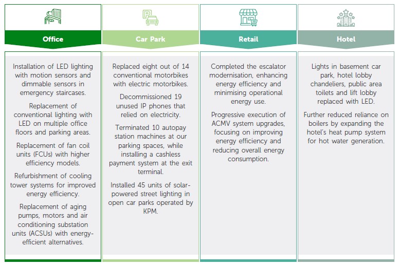 PETRONAS Twin Towers (GBI Gold), Menara 3 Petronas (GBI Silver) and Menara Maxis (Silver) serve as benchmarks for our commitment to green building standards. These certifications, representing 60% of our office portfolio, reflect ongoing efforts to embed sustainability within our built environment.